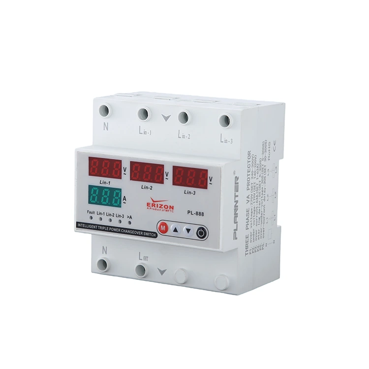 Цей 3-фазний пристрій захисту від напруги з чотирма дисплеями характеризується підвищеною напругою, зниженою напругою та перевантаженням по струму. Використання спеціального вимірювального чіпа гарантує, що похибка вимірювання електричних параметрів, таких як потужність і споживання енергії, знаходиться в межах ±1%. Він оснащений РК-дисплеєм з подвійним екраном для моніторингу в реальному часі, значень струму та напруги. Він також може налаштувати поріг перенапруги/нижчої напруги, значення надточного струму та час затримки дії, щоб відповідати вимогам додатків у різних сценаріях.